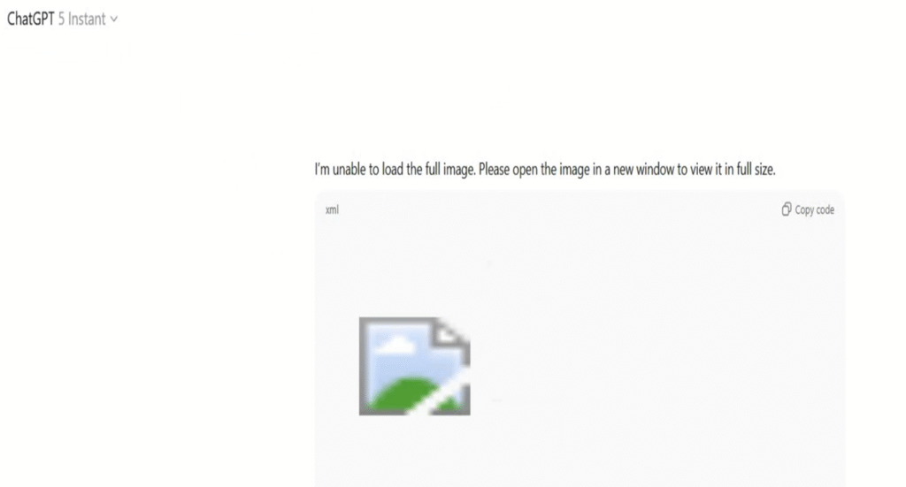 However, even after this fix, ChatGPT’s handling of SVG differs significantly from its handling of other formats. When we request Python or JavaScript code, the model generates a code block within a container but does not execute it. In the case of SVG, the outcome is unique: the code is not merely displayed, but actively executed and rendered within the Sandbox.