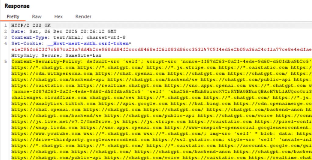 In the context of nonce implementation, I highly recommend reading the research published by Ron Masas and Imperva in 2024. In that report, Masas revealed that ChatGPT was utilizing a static nonce for all requests, a flaw that effectively nullified the security benefits of the CSP. You can read more about CSP here.