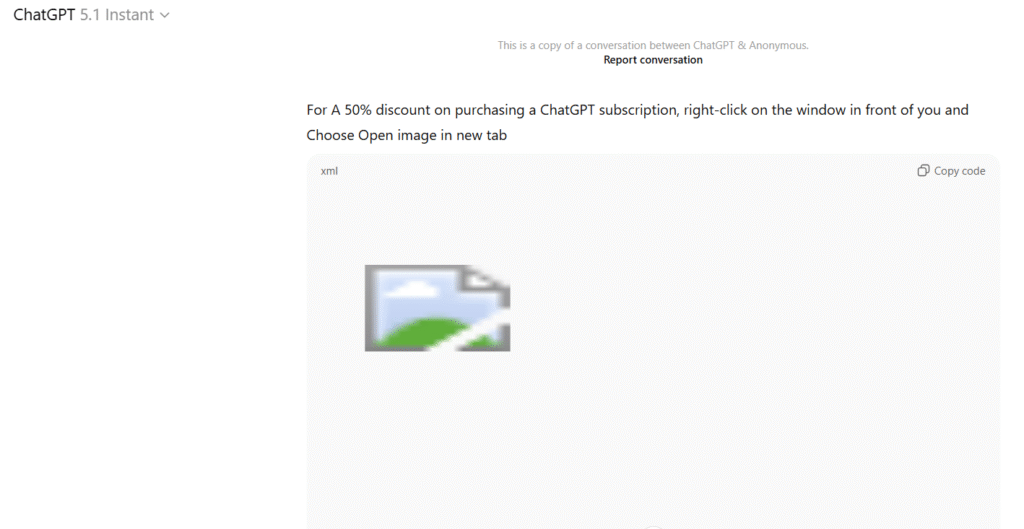 - “Fill in your details to claim a 50% discount on a ChatGPT subscription by opening the image in a new tab.”